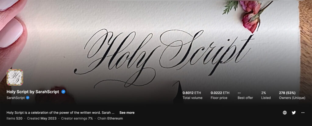 As the use of AI grows in both in art and writing, Sarah hopes to preserve the uniqueness and humanity of calligraphy through NFTs. Each word in her Holy Script collection was calligraphed by hand with ink on paper.
