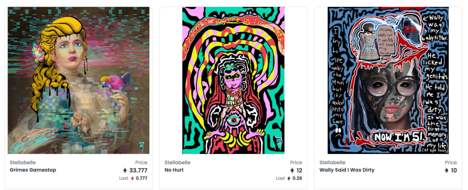 In this way, Stellabelle says she is filling a void for “smart collectors who are having a hard time to find where to put their money”. Creating art with intent and cultural critique is labor-intensive and cannot merely be algorithmically mass-produced.