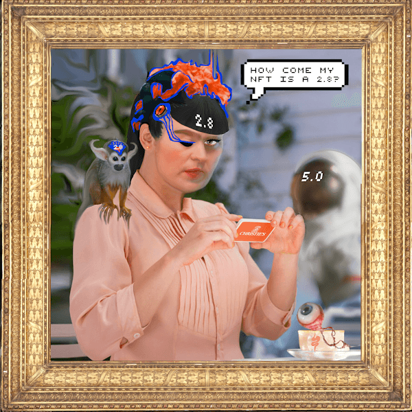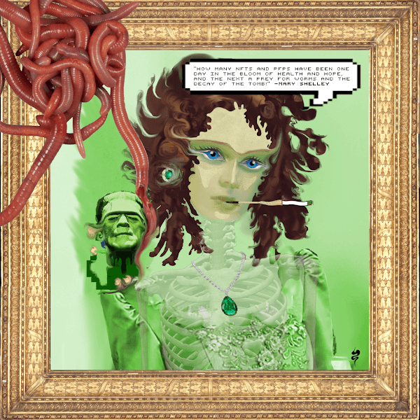 Humor and symbolism course through Stellabelle’s work. She especially likes to poke fun at inconsistencies and inequities in the nascent NFT scene, such as fascist overtones in the Bored Ape Yacht Club or gender inequity in NFT valuations.