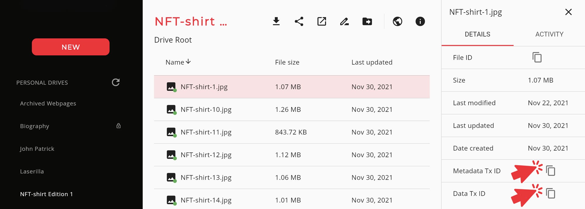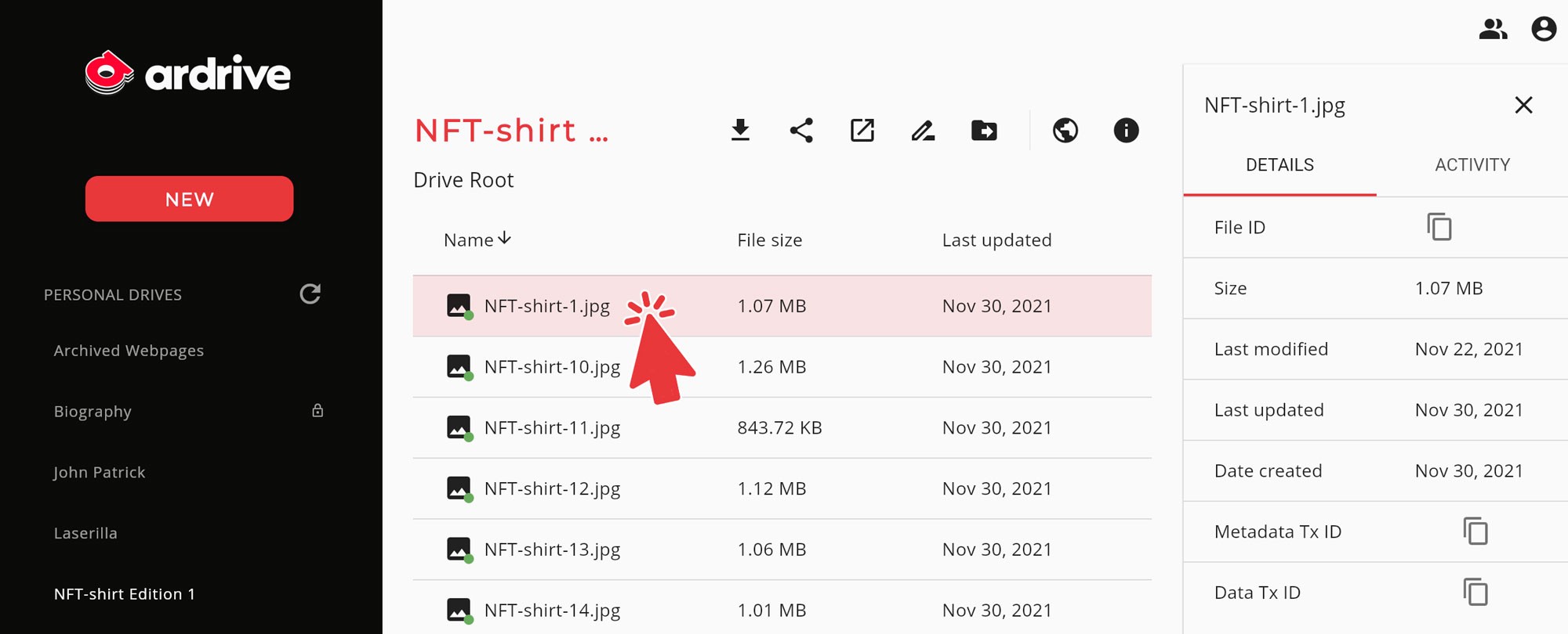 Double click onto the NFT file you just uploaded to ArDrive and a number of icons appear above the file. Details about your files will appear on the right of your screen.