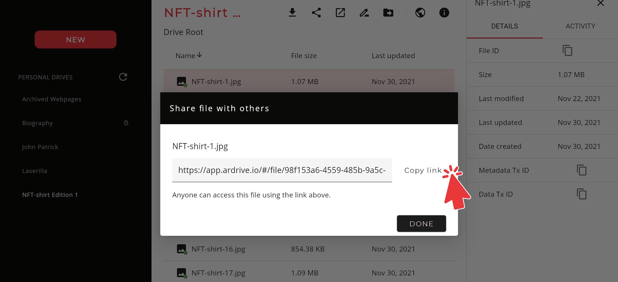 If you hit the share file button a window will pop up with a link. This is ArDrive’s permalink for your file on the permaweb. Copy this link and put it in your web browser and you will be able to download the NFT. You can also get an Arweave URL by clicking the preview icon. It links to the same location as ArDrive’s permalink.